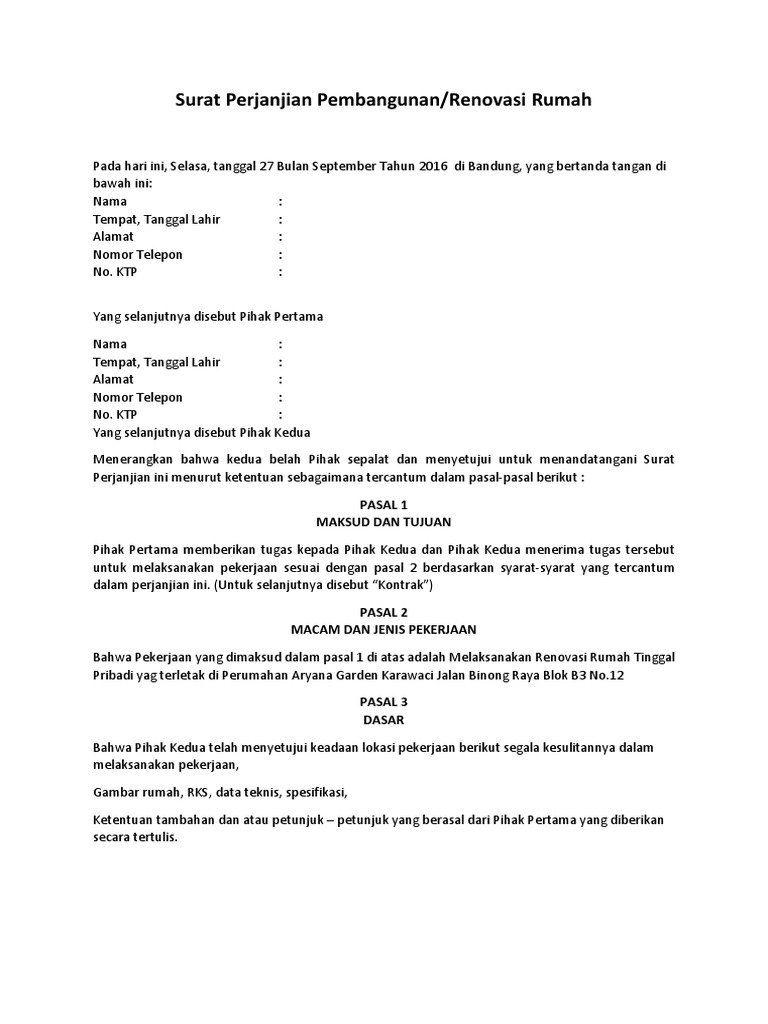 Kontrak Pelaksanaan Pekerjaan Pembangunan Renovasi Rumah Tinggal Pada Hari Ini Tanggal Kami Yang Bertanda Tangan Di Bawah Ini Pdf Free Download from docplayerinfo Surat perjanjian membina rumah pdf. Kedua belah pihak telah bersepakat mengadakan Perjanjian Pemborongan Pekerjaan Bangunan RENOVASI RUMAH di Jalan Ikan Cakalang Perum Cakalang Indah 2 Kav B Head Office. Contoh Surat Perjanjian Renovasi Rumah Transaksi jenis tertentu membutuhkan surat perjanjian secara resmi agar semua pihak yang terlibat didalamnya memiliki hak dan kewajiban yang sesuai.